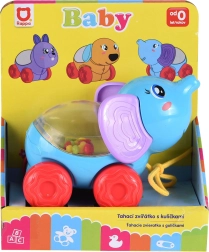 Vlečni slon z kroglicami je igriva živalica na kolescih, ki zabava otroke pri prvih korakih in skupnih igrah. Pri vlečenju ali potiskanju v prozornem delu poskakujejo barvite kroglice, kar otroke naravno motivira k gibanju in raziskovanju.