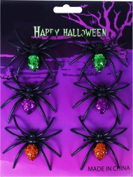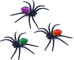 Majhni gumijasti pajki, ki so odlična dekoracija za noč čarovnic! Pakiranje vsebuje 6 kosov barvitih bleščečih pajkov.