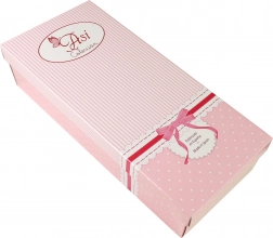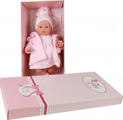 Punčka je oblečena v stajliš rožnat komplet: pletena oblekica, topel plašček z vezanjem na cofke, pletena kapica in mehke nogavičke. Pakirana je v elegantni darilni škatli, zato je idealna kot darilo za otroke od 3 let.