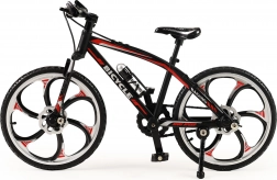 Odkrijte podrobno izdelano mini gorsko kolo v elegantni črni barvi z rdečimi poudarki. Ta kovinski model s prostim tekom koles zvesto posnema pravo kolo – od okvirja in krmila do izrazitih obročev. Odlično darilo za ljubitelje kolesarjenja ali kot dekoracija za mizo oziroma polico.
