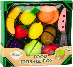 Zelen zabojček služi kot praktično shranjevanje in uči otroke pospravljanja po končani igri. Realistične oblike in barve sadja pomagajo pri prepoznavanju vrst ter spodbujajo zdrave prehranske navade skozi igro.