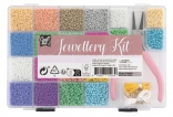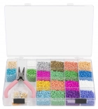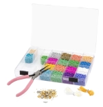 Velik komplet perlic za izdelavo nakita vsebuje – 20 barv perlic, kleščice, zlate in srebrne zaponke ter spojke + zlato in srebrno jekleno vrvico za nanizavanje.