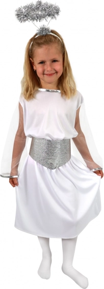 Ta otroški angelski kostum je zasnovan za udobno nošenje in impresiven videz. Nežne tekstilne obleke v beli barvi laskajo vsaki mali vili, medtem ko prosojni rokavi in srebrni detajli kostumu dodajo slovesen učinek. Del kompleta je tudi halo – svetoavra na naglavnem obroču, ki celoten outfit popolno zaokroži.