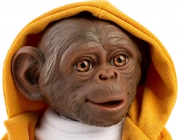 Opica je oblečena v slogovni rumeni pulover in ima zelo realistično oblikovane obrazne poteze, kar ustvarja vtis prave opice.