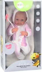 Lutka je narejena iz varnih in trpežnih materialov, ki otrokom zagotavljajo varno igro. Poleg tega komplet vključuje dudko na verižici, pripeto na oblačilo lutke, in mehko odejo.