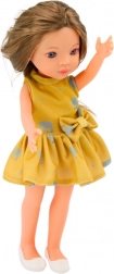 Lutka ima rumene obleke okrašene z vzorcem slonov in bele čevlje, ki dodajajo eleganco.