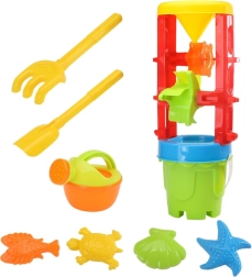 - Velik mlinček za pesek, vedro, lopatka, grabljice, kannica, 4 modelčki