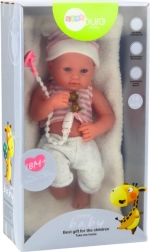 Nežne obrazne poteze in belo‑rožnat komplet s kapico ustvarjajo zvest videz pravega dojenčka, ki bo navdušil otroke.