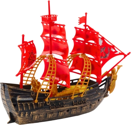 Ta piratska ladja v elegantni zlato rjavi barvi z izrazitimi rdečimi jadri otrokom prinaša vzdušje skrivnostnih morskih odprav. Realistični detajli, topovi in piratski simboli spodbujajo domišljijo ter vabijo k odkrivanju zakladov in napetim bitkam na valovih.