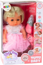 Ta set vključuje posebno stekleničko, ki jo lahko napolnite z vodo. Po hranjenju z vodo lutka dejansko lahko "lula", kar doda avtentičnost in omogoča otrokom vživeti se v vlogo negovalca. Igra z hranjenjem in previjanjem lutke uči odgovornosti in skrbi za druge.