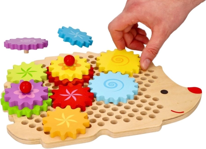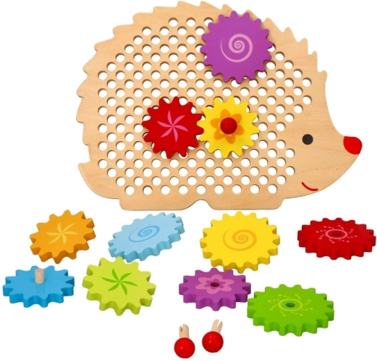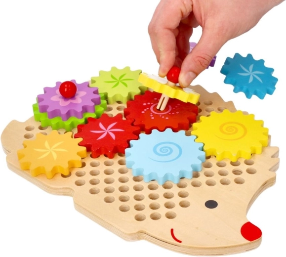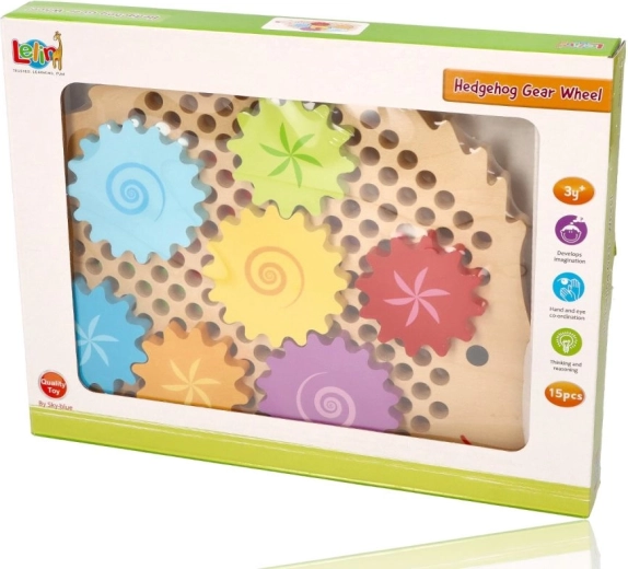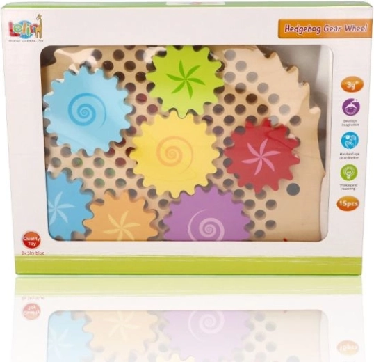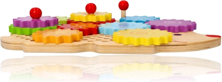 Lesena sestavljanka v obliki ježka s pisanim naborom zobnikov podpira zgodnje učenje skozi igro. Otroci lahko nameščajo koleščke na čepe, preizkušajo različne kombinacije in opazujejo, kako se vsa kolesa zavrtijo. To krepi logično razmišljanje in naravno pojasnjuje principe vzroka in posledice.