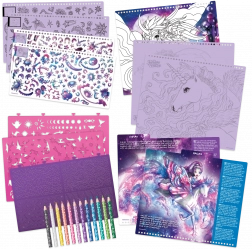 Odkrijte čar ustvarjalnega ustvarjanja s pobarvankami Nebulous Stars v vijolični izvedbi. Ta bogato opremljen set ponuja vse za ustvarjanje čarobnih risb fantazijskih konjev – od nalepk in šablon do plastičnih modelčkov in barvic. Idealno za otroke od 7 let, ki obožujejo domišljijo, barve in natančne detajle. Ustvarite svoje zvezdne zgodbe ter razvijajte fino motoriko in domišljijo s 250 nalepkami, 80 šablonami in 12 barvicami v enem paketu.