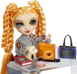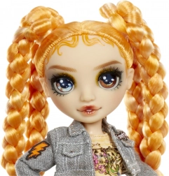 Punčka RAINBOW HIGH Sparkle & Shine Clementine prinaša izrazit oranžen videz, jeans jaknico, krilo s karo vzorcem in platform čevlje z napisom RAINBOW. Priloženi so stojalo, glavnik in tematski dodatki na motiv kave, ki širijo možnosti igre in zgodb.