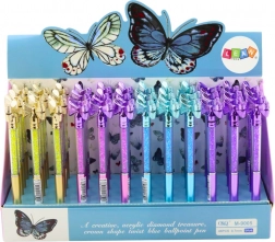 Eleganten kemični svinčnik z dekorativno mašnico in prozornim ohišjem, napolnjenim z bleščečimi kristalčki, doda pisanju edinstven pridih. Ima moder črnilo, konico 0,7 mm za tekoče pisanje in je na voljo v mešanici barv – vijolična, turkizna, rožnata in zlata.