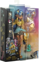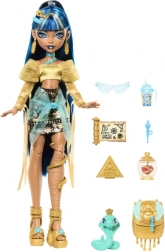Podajte se na avanturo z Monster High Cleo de Nile, ki postavlja modo mumij na nov standard! Ta čudovita punčka je opremljena z elegantnimi zlatimi in modrimi oblačili ter različnimi stilskimi dodatki, ki poudarjajo njen kraljevski videz.