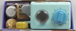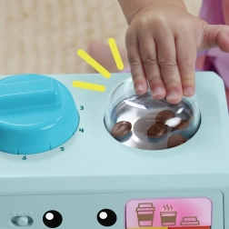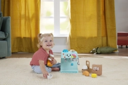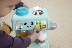 Otroci lahko pritisnejo gumbe za simulacijo priprave kave, vrtijo kolesce za penjenje ali premikajo mlinček za kavo, da vidijo, kako poskakujejo kavna zrnca. Del igrače so tudi igrani dodatki: dve skodelici za kavo, žlička, rogljiček, mehka torba za blago s pokrovom, skodelica za mleko in nosilna podloga.