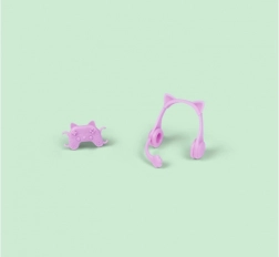 V kompletu so izrazite slušalke z ušeski in majhen igralni krmilnik – idealni rekviziti za igralne zgodbe in digitalne pustolovščine.