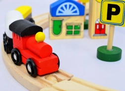 - Lesni tiri, vlak z vagoni na magnet, figurice, avto, stavba, prometni znaki