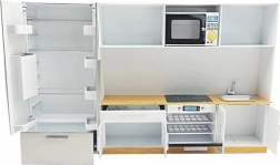 Set vsebuje vse, kar potrebujete za ustvarjanje popolnoma opremljene kuhinje. Majhni gospodinjski aparati – pečica, mikrovalovna pečica, hladilnik, zamrzovalnik in celo izdelovalnik ledenih kock!