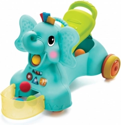 Interaktivna plošča z lučkami, gumbi s številkami in melodijami prebuja čute in uči povezav, medtem ko mehka ušesa z masažnimi izboklinami služijo kot varna grizala. Slonov rilec na zabaven način pobira raztresene žogice in jih vrača v sprednjo košaro ali na tla; dodatne žogice lahko shranite v prostor pod sedežem. Za brezskrbnost staršev in otrokovo stabilnost je mogoče uravnavati hitrost koles.