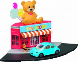 - Plastična stavba trgovine z igračami, kovinski model avtomobila 1:43, ulični in pločniški elementi, dodatki