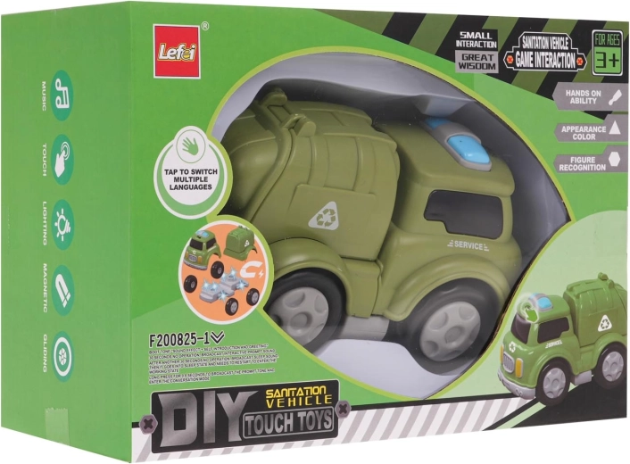 Interaktivno smetarsko vozilo za otroke od 3 let je izdelano iz kakovostne plastike in ponuja zvočne ter svetlobne učinke. Zahvaljujoč magnetnim delom ga je mogoče zlahka razstaviti in ponovno sestaviti.