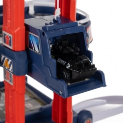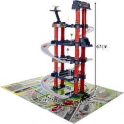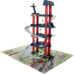 Interaktivno dvigalo lahko pritrdite levo ali desno, upravlja se z barvnimi gumbi (gor/dol), spremljajo ga utripajoče luči in zvočni efekti (sirene, hupa, delovni stroji), ki še okrepijo otroško domišljijo. V kompletu je velika igralna podloga z mestnim zemljevidom, na katero postavite garaže in razporedite znake, poleg tega pa 2 avtomobilčka in helikopter.