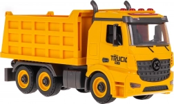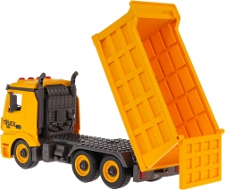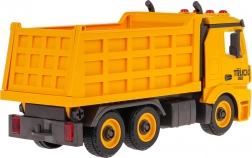 Praktične funkcije vključujejo dvižno in spuščajoče korito z odprtljivim zadnjim delom ter možnost snema priklopnika/korita s podvozja. Na kabini najdete utripajoče luči in nadzorne gumbe za zvoke zagona, vzvratne vožnje, hupa in alarm. Igrača je pripravljena za uporabo takoj po razpakiranju – baterije so priložene.