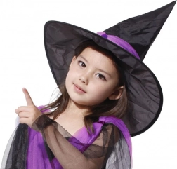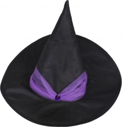 Klasičen črn klobuk z vijoličnim okrasjem popolno dopolni kostum in poudari čarovniško vzdušje.