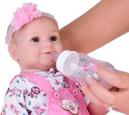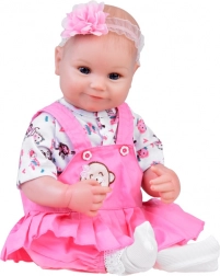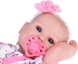 Ta ljubka dojenčkova punčka je izdelana iz kakovostnih materialov z veliko pozornosti do detajlov – ima mehko telesce, gumijaste gibljive rokice in nogice ter realistične obrazne poteze z modrimi očmi in dolgimi trepalnicami. Glava ima pobarvane lase, zato je idealna tudi za najmlajše skrbnice. Oblekica v rožnatih tonih z motivi živalic in cvetličnim naglavnim trakom punčki doda nežen in prikupen videz.