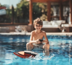 Vgrajeni senzor aktivira čoln le ob stiku z vodo. Ščiti elektroniko in je primeren za otroke.