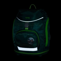 Glavni predal z zatezno vrvico in magnetom, notranji razdelilnik, stranski žepi na zadrgo ter sprednji žep za malico. Odsevni elementi povečujejo vidnost na poti v šolo.