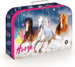 Praktičen otroški kovček OXYBAG z motivom konja je idealen za likovne potrebščine, igrače in male zaklade. Zahvaljujoč dimenzijam 34 × 23 × 10 cm sprejme format A4, izdelan je iz laminirane kartonske lepenke, prevlečene s tiskaným papirjem, zapira se z kovinsko sponko in enostavno vzdržuje z vlažno krpo.