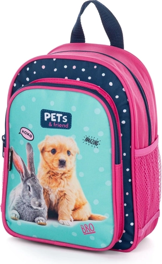Lahek in udoben otroški nahrbtnik z motivom ljubljenčkov za predšolske otroke od 3 do 6 let. Ponuja eno prostorno glavno režo, manjši žep za malico in stranska žepka za steklenico. Odličen za krožke, izlete in vrtec.