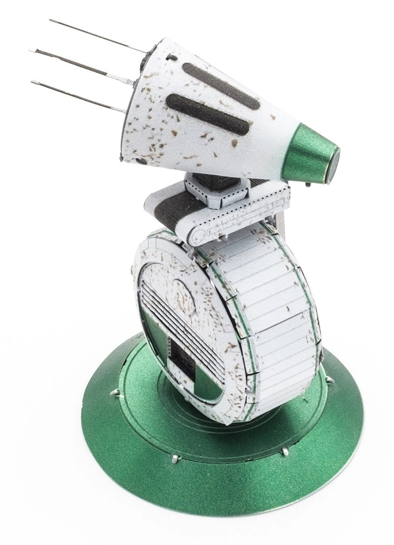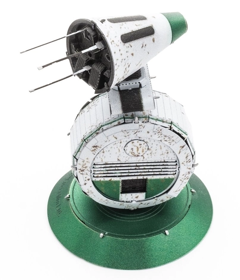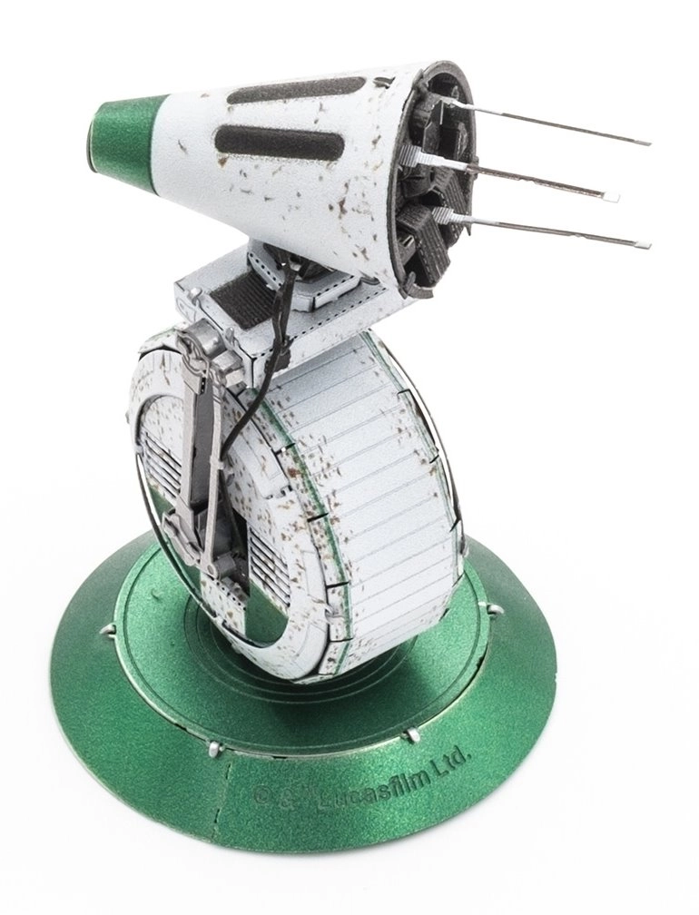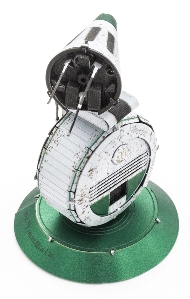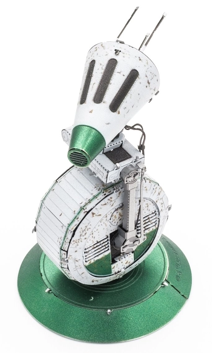 Fine linije in strukture, ustvarjene z laserskim graviranjem, dajejo modelu globino in realističen videz. Sestavljen droid izgleda kot majhen filmski rekvizit.