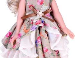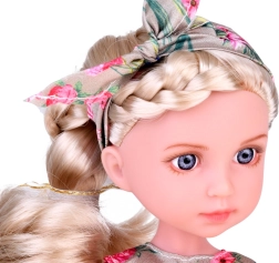 Ta očarljiva punčka je popolna izbira za vsako malo ljubiteljico mode. Z dolgimi blond lasmi, spletenimi v eleganten kito, je oblečena v elegantno cvetlično obleko z volančki, ki jo dopolnjujeta cvetlični naglavni trak in beli čeveljčki. Celoten slog je preprosto osupljiv!