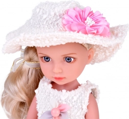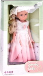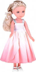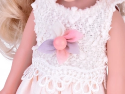 Ta punčka ima dolge blond lasje spletene v elegantno kito in je oblečena v lično koktajl obleko v odtenkih roza s srebrnimi naramnicami. Okrasi jo nežen cvet in nosi kremno bolero. Na glavi ima stilen krem klobuk, ki ji doda čar in eleganco, in na nogah bele čevlje. Izgleda preprosto ljubko!