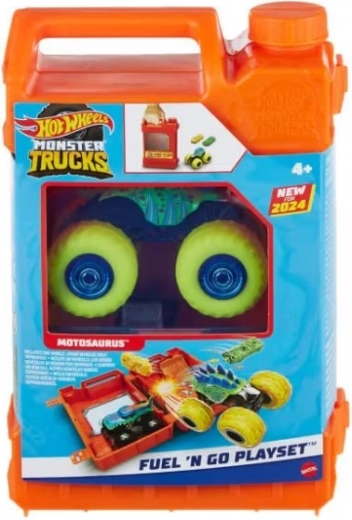 Potopite se v epske pustolovščine z igralnim setom Hot Wheels Monster Trucks Kanister Fuel 'N Go! Ta skrbno zasnovan set v obliki bencinskega kanistra se odpre v mini areno za akrobacije in prostor za popravila. S priloženim vozilom Motosaurus v merilu 1:64 se lahko zlahka zapeljete na rampo in podrete dva zmečkana avtomobila. Dodatna vozila in tovornjaki povečajo raven uničenja! (Vsebuje dva zmečkana avtomobila. Dodatna vozila na slikah se prodajajo ločeno.)