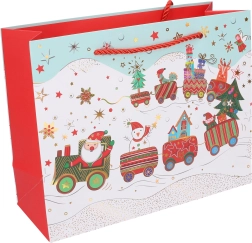 Slogovna božična darilna vrečka velikosti M (32 × 26 × 10 cm) za elegantno zavijanje daril. Idealna za knjige, kozmetiko ali manjše škatle. Na voljo v 4 različicah z božičnimi motivi in s trdnimi ročaji za udobno prenašanje.