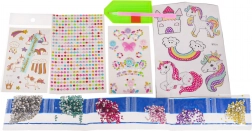 Komplet vsebuje nalepke z jednorožci, bleščeče kamenčke in šablone. Otroci ustvarijo izviren dizajn ter razvijajo fino motoriko in ustvarjalnost.