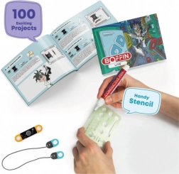 V paketu najdete magnetno podlago, 27 elektronskih modulov, prevodni flomaster, čistilni svinčnik, šablono za risanje komponent ter podroben ilustrirani priročnik. Projekti vključujejo labirint, DJ‑pult, alarm proti kraji, futuristične glasbene eksperimente, prevodne križce‑krožce in senzor zaklenjenih vrat.
