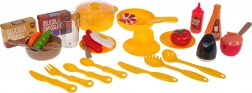ponev, lonec s pokrovko, skleda, posodica s pokrovčkom, lonček, 3 × krožnik, lopatica, zajemalka, nož, vilica, žlica, jedilni pribor za otroke, kuhinjski pripomočki, kečap, preliv, solnica, škatlice za piškote, makete živil (paprika, paradižnik, grah, solata, korenje, kozica, jajce, hrenovke, riba)