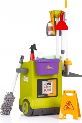 Popolna oprema za realistično igro: od metle in ročne metlice z zajemalko do krp in razpršila ter opozorilne table. Otroci imajo vse pri roki na praktičnem vozičku.