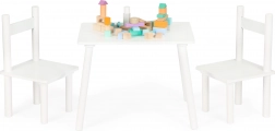 Ustvarite otrokom lasten kotiček za igro in učenje. Beli lesen komplet ECOTOYS združuje preprost skandinavski dizajn s trpežno izvedbo: masivne borove noge zagotavljajo stabilnost, plošča iz MDF pa se zlahka ohranja čista. Komplet vsebuje mizo in dva udobna stola z usklajenimi proporcami.
