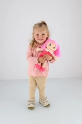 Rožnati lasje, oblekica in prijazen nasmeh spodbujajo domišljijo ter podpirajo čustveni razvoj otroka.