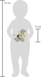 Dinozaver ponuja igro s premikanjem po kolesih in interaktivni labirint s kroglicami, kar razvija tako fine kot grobe motorične sposobnosti otrok.