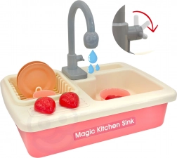 Po vstavitvi 2× AA baterij začne črpalka krožiti vodo. Otroci se na igriv način urijo v pomivanju posode, izpiranju in varčni uporabi vode.