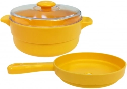 Lonec s pokrovko, ponev, krožniki, skodelice in stekleničke za začimbe – vse, kar mali kuhar potrebuje.