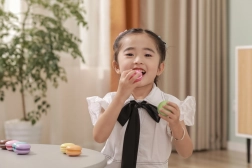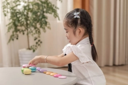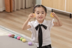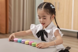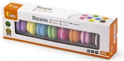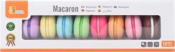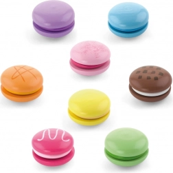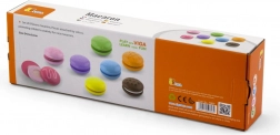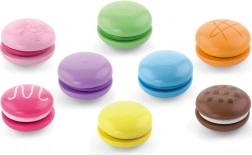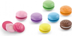 Set vsebuje 8 realistično izdelanih makronov v nežnih pastelnih barvah. Vsak makron je sestavljen iz dveh delov, povezanih z ježkom, zato jih lahko otroci zlahka “razpolovijo” in znova spojijo – tako vadijo prijem, koordinacijo roka–oko in odkrivajo barvne kombinacije.
