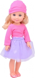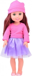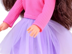 Elegantna punčka, visoka 36 cm, je idealna spremljevalka za male gospodične. Zahvaljujoč dolgim rjavim valovitim lasem, ki jih je mogoče česati in oblikovati, krepi otroški modni čut ter razvija spretnosti pri negi las. Oblečena je v stilno rožnato bluzo in vijolično krilo, skupaj z rožnatimi čeveljčki in čepico pa ponuja eleganten videz. Premične roke in noge omogočajo postavljanje lutke v različne položaje, kar podpira ustvarjalno in domišljijsko igro.